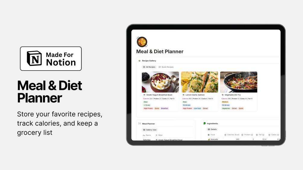 Take control of your meals with this easy-to-use Notion Meal & Diet Planner.