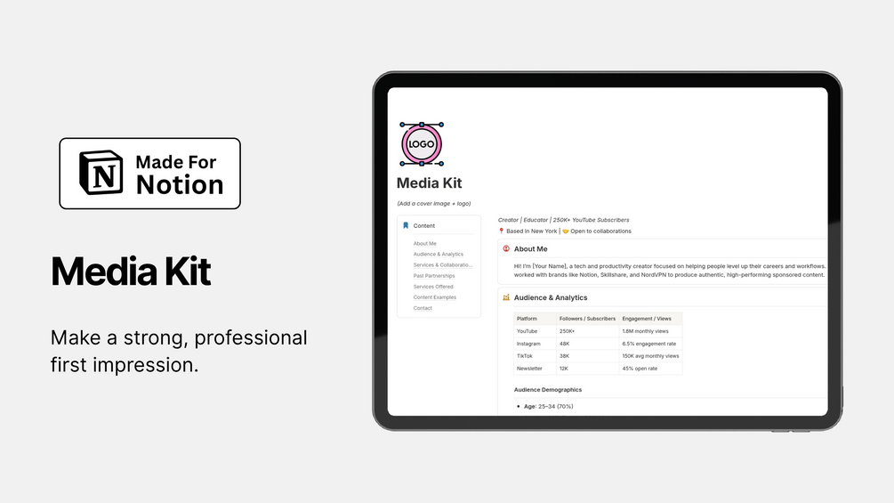 A professionally designed Notion Media Kit Template to help you pitch yourself or your brand with confidence. Perfect for creators, freelancers, entrepreneurs, and influencers — this template gives you a clean and effective way to showcase: