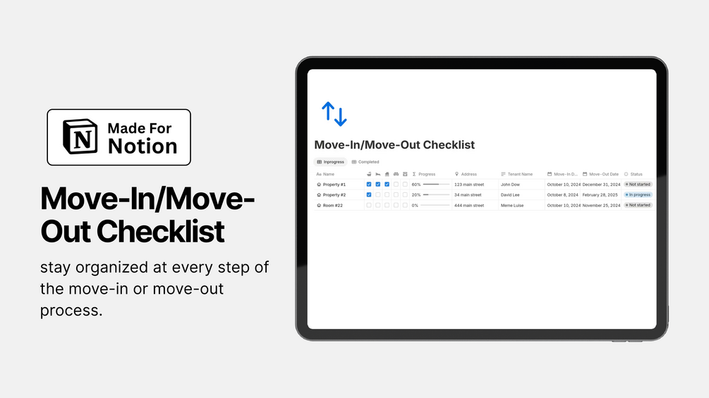 Whether you're a landlord preparing for new tenants, a property manager handling multiple units, or a renter wanting your full deposit back, this Notion template helps you stay organized at every step of the move-in or move-out process.