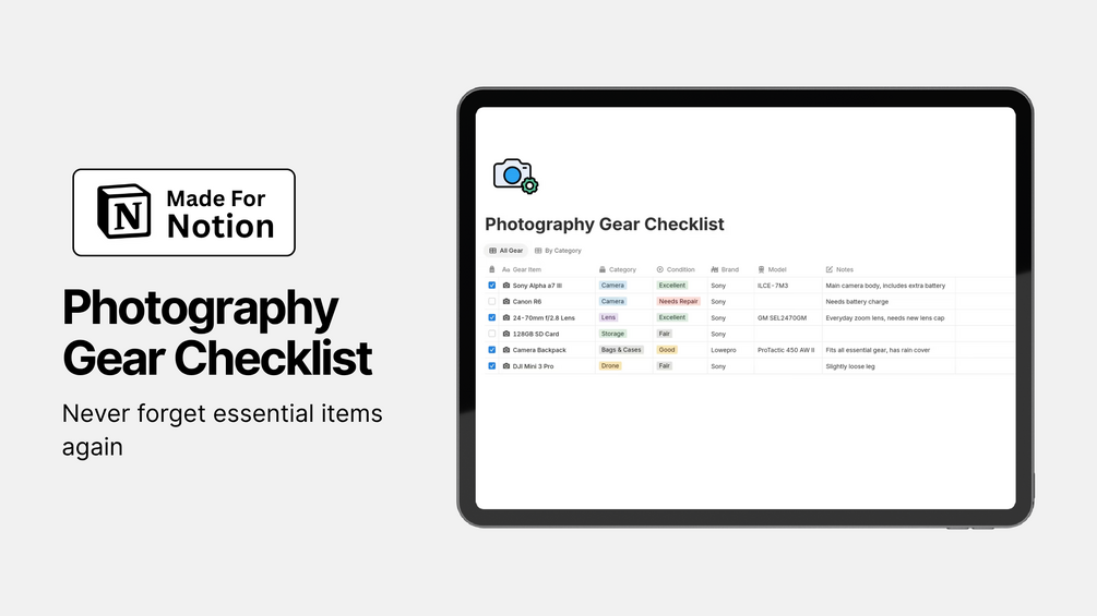 Stay organized and stress-free before every shoot with this clean and practical Photography Gear Checklist built in Notion.