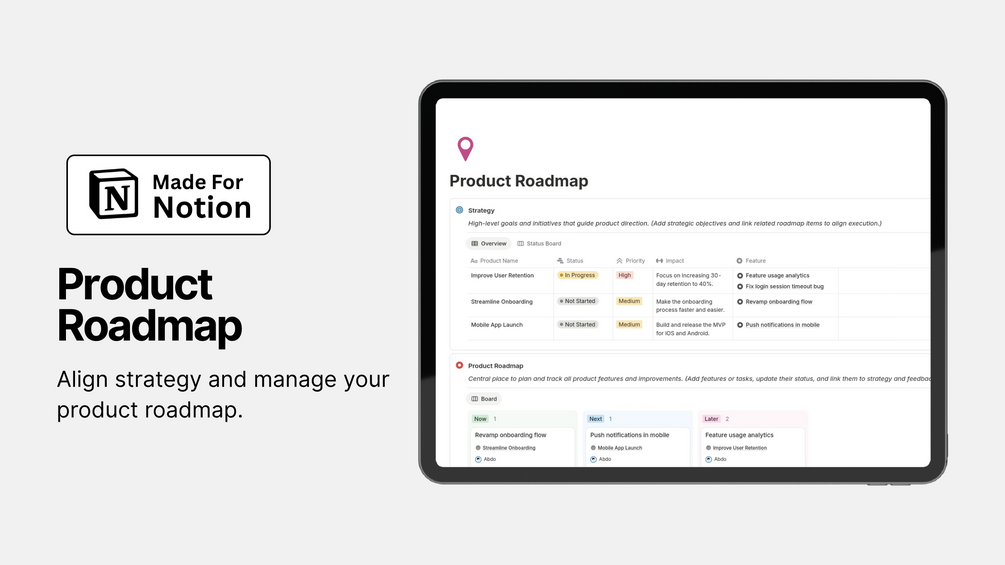 Stay focused and ship faster with this clean, easy-to-use Product Roadmap Notion template.