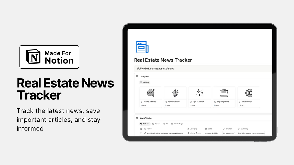 The real estate world moves fast .. from interest rate changes to zoning laws and market trends. This Notion template helps you track the latest news, save important articles, and stay informed so you can act with confidence.