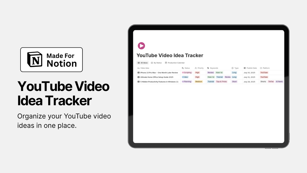 This Notion template helps you organize your YouTube video ideas in one place. Whether you're a new creator or a seasoned YouTuber, this template gives you a clean pipeline to manage everything from brainstorming to publishing.
