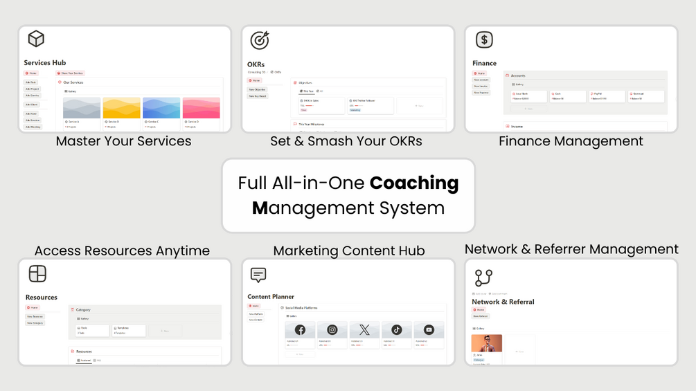 The Notion Consulting OS is your all-in-one solution tailored specifically for coaches and consultants looking to streamline their business operations. This comprehensive template serves as a centralized hub, enabling you to effortlessly manage every aspect of your practice.